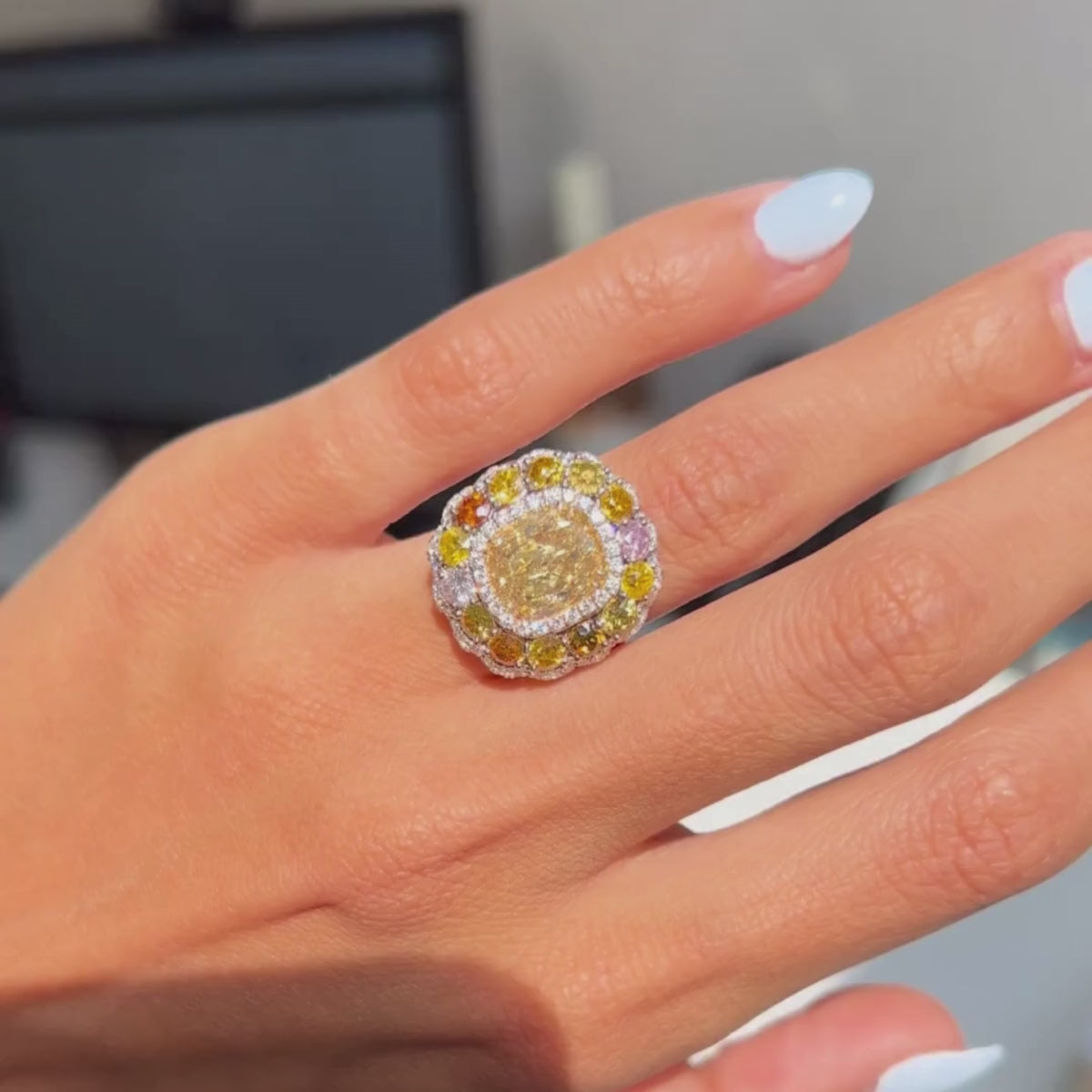 18kt White Gold Cushion Yellow Diamond Ring Featuring: