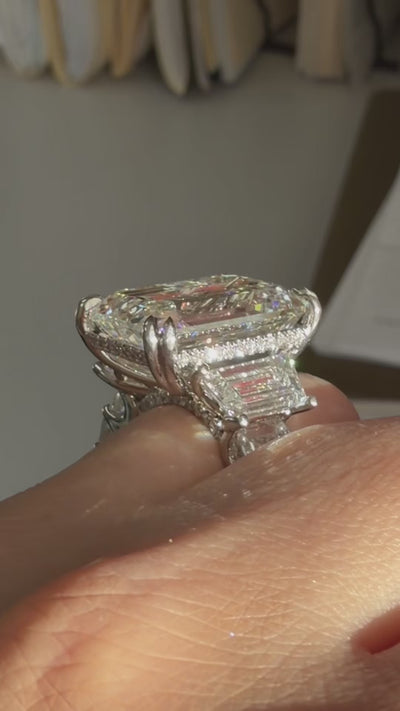Not with an emerald cut. The elongated shape distributes carat weight beautifully across the finger, making even a 5ct or 6ct stone feel wearable and graceful. Trillion accents also lay relatively flat, keeping the profile sleek rather than bulky.