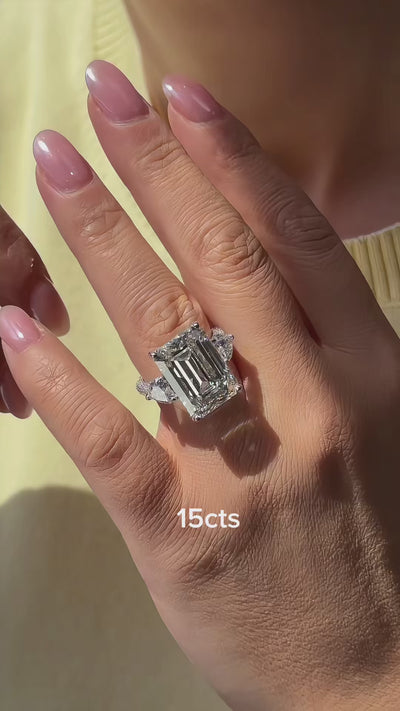 Not with an emerald cut. The elongated shape distributes carat weight beautifully across the finger, making even a 5ct or 6ct stone feel wearable and graceful. Trillion accents also lay relatively flat, keeping the profile sleek rather than bulky.